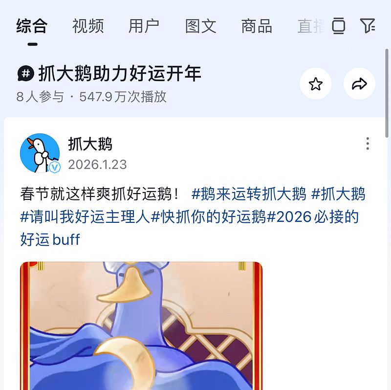 此外,相关话题 #抓大鹅助力好运开年 累计播放量超过540万,进一步激活游戏热度,最终助力《抓大鹅》成为抖音端首款DAU破千万的小游戏。