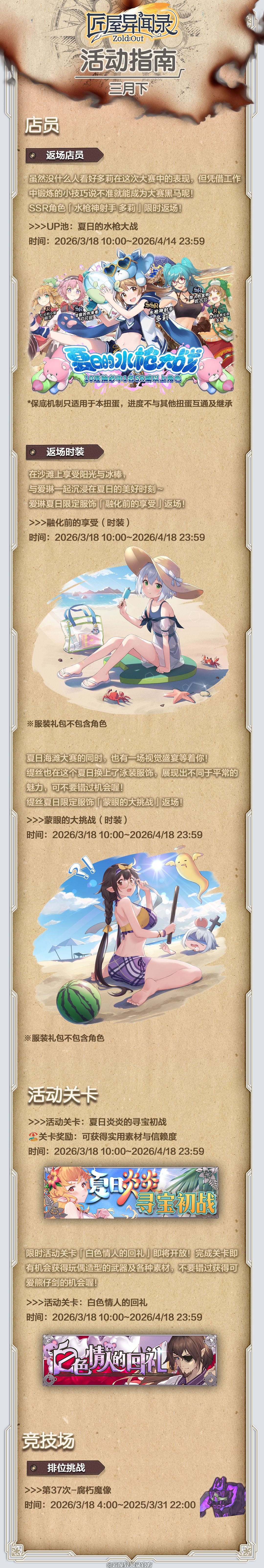 3月18日10点版本更新后,SSR店员「水枪神射手 多莉」限时返场!夏日沙滩怎能少了换装时刻?爱琳限定服饰「融化前的享受」与缇丝限定服饰「蒙眼的大挑战」清凉返场,泳装造型展现别样魅力,可不要错过喔!