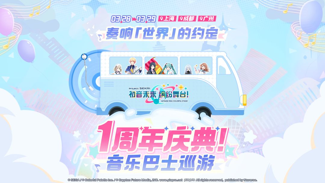 为庆祝《初音未来:缤纷舞台》上线 1 周年,我们特别企划音乐巴士巡游,将于3月28日–3月29日暖心启航!