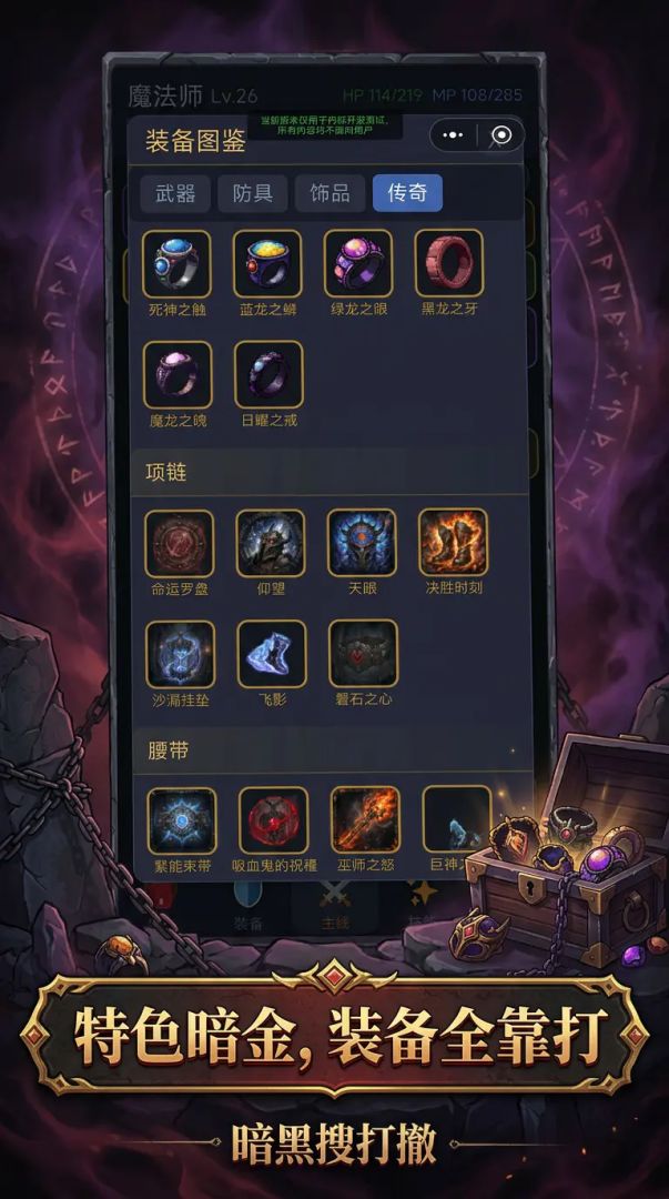 融合暗黑和搜打撤。AI已实现一键装备、集中分解这类高交互RPG会涉及到的玩法内容,且数值做得较为平滑。在UI和icon的提示交互上也有提升,寻怪战斗页面下有分支地图提示推图进度,相比纯文字挂机加强了操作指引。