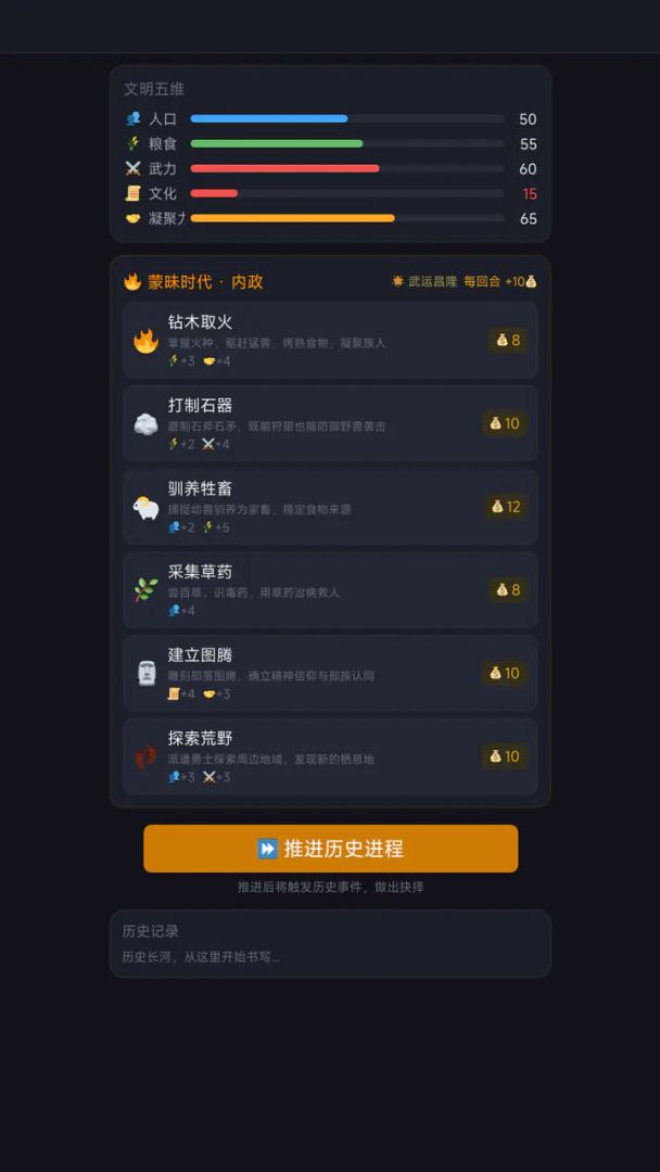 AI生成人口、粮食、武力、文化、凝聚力五种属性,资源调配和随机事件符合逻辑、数值平顺,UI布局合理、icon指向明确,以治理年限倒序的排行榜易于统计且刺激重开游戏。游戏完成度高、事件丰满,AI已实现对文明模拟器的完整复刻。