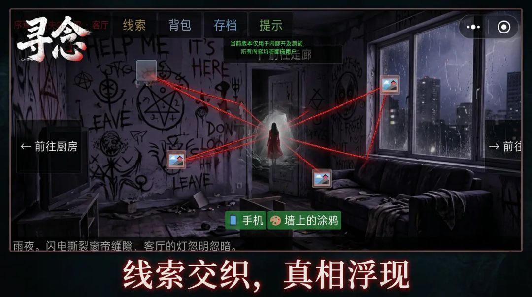 AI通过线索互动、组合的功能,实现悬疑推理类作品的解谜玩法。本作在场景中设置43种可收集道具、28条线索,并可以将其组合分析出四种不同的故事结局。画面、音乐在微恐氛围上展示合理、有沉浸感,剧情文本质量过关。