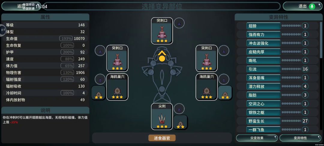 前言:游戏本质上只需要两种器官,进攻和续航,大部分的器官变异以及物理和辐射伤害属性到后期都挺强的可以乱杀,但前提是能发育起来,没发育起来或者发育的不够快就会被人机鱼两口就舔死了,所以能快速发育就很关键,只有发育起来你才能随心所欲的玩你想要的组合,视频里的组合是我测试下来的版本之子