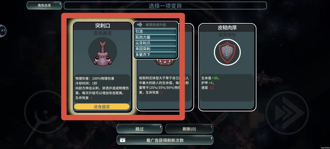 【增重】:不管你玩啥变异,这个绝对是必点的,只要吃东西就有概率增加生命上限,无限成长最强变异!需要注意的是它需要先点出【皮糙肉厚】才会解锁,如果不点这个前置变异永远也刷不出来,导致很多人误认为它出现的概率极低