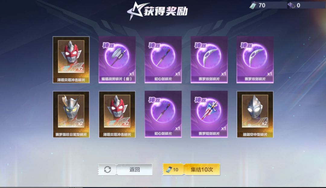 经过一段时间的叮铃桄榔一顿做任务,我们的抽奖卷也是来到了80张,鼠鼠个人也是赛少党,所以自选了一个闪耀赛罗方便推图,以下就是我们抽奖情况,70抽出了闪耀赛罗,整体来说还算不错,出了神器光弩和披风