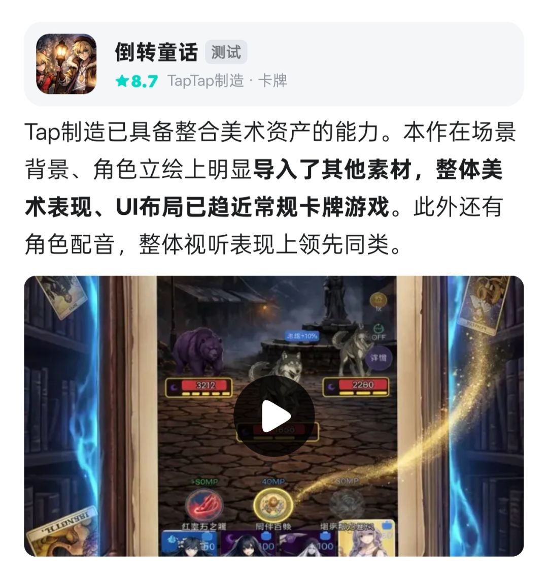 感谢官方,提供帮助与支持的朋友们,让我能够在ai的协助下,一周做出战斗demo并发布,并且在一些小问题中导致计划20号上线的新版本提前更新,不过所幸新版本内容几乎可以完成闭环,并且上线后才发现还有更多的bug需要修复,不过看到玩家的支持,咱还是很开心的,所以借着上推荐位的由头,再送30抽!![[表情_开心]](https://img-tc.tapimg.com/market/images/48516f625646b5ea2c66f0cab3c9c52a.png)