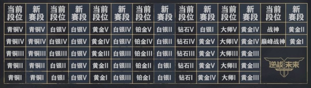 新赛季开启后,各位逆行者们的段位也将被重置,除青铜Ⅴ~白银Ⅴ段位保持不变外,新赛季的起始段位将取决于各位逆行者们上赛季结束时的最终段位,详情如下: