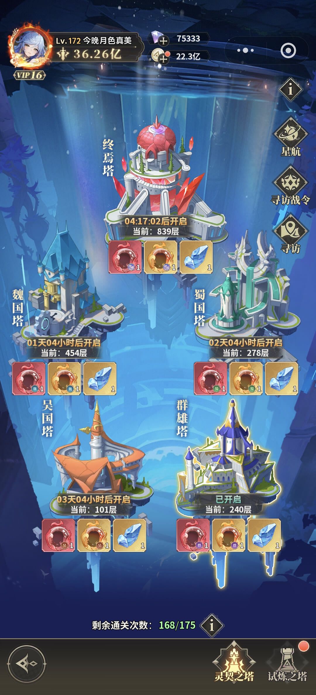 图里可以看见我的终焉塔爬的比较高其他塔基本上没爬多少,所以我们优先爬终焉塔爬不动了再去爬别的塔,除了终焉塔其他四个塔没有先后的优先级随缘。
