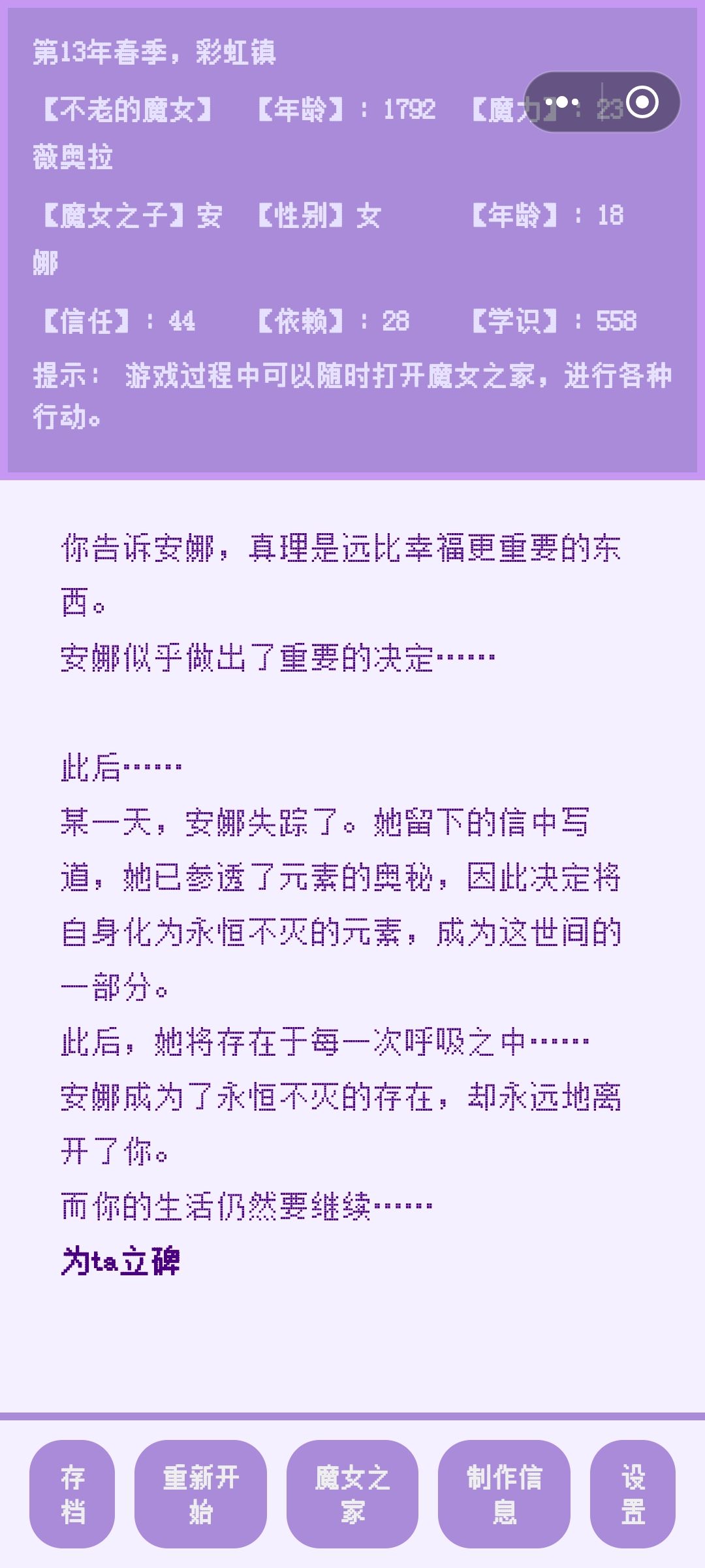 本来以为已经结束了,结果我才发现是第二周目开始,说实话人已经有点懵了,名字也不改,就叫母亲名字薇奥拉。然后二周目开头当了把坏魔女坏母亲,对一个叫安娜的孩子严厉教育+暴力(p3),孩子后面和我不来往了。