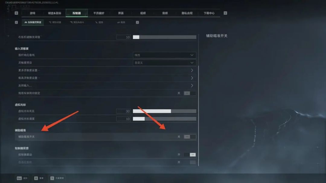 在找到“辅助瞄准开关”,把这个选项关闭。用手柄打FPS游戏都知道,这个功能在手柄上相当于微自瞄,但是对于键鼠毫无意义,甚至如果这玩意代码在键鼠正常瞄准过程中生效会影响键鼠微操。以为FPS的手柄辅助瞄准是瞄准到目标物体的模型边缘,也许对于APEX那种高TTK的游戏来说能有助于跟枪,但是对于三角洲这种TTK非常短的游戏,本来打到胸口的子弹打到手上的话那可真是既分胜负,也决生死了。