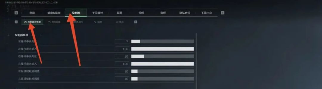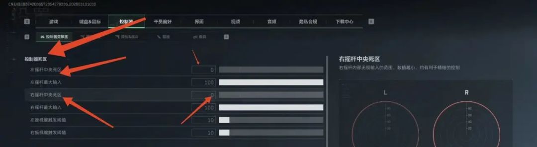 在“控制器死区”分栏,把“左摇杆中央控制死区”、“右摇杆中央控制死区”全部设置到“零”这个数值。