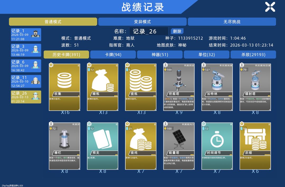 在普通模式45波次一起点了9/10变异,很快家被推干净了,之后bug出现,家一直卡住了血量,用战术卡解决了围攻的敌人。在51波准备时建造了建筑,奇迹没出现,石头人两拳轮爆了基地