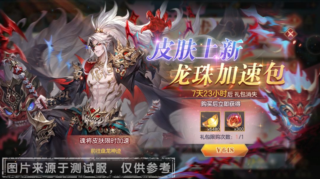 龙珠加速包:内含「龙珠」*300,「元宝」*6480,售价648元,活动期间限购1次。