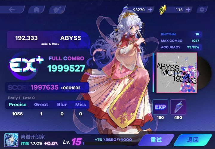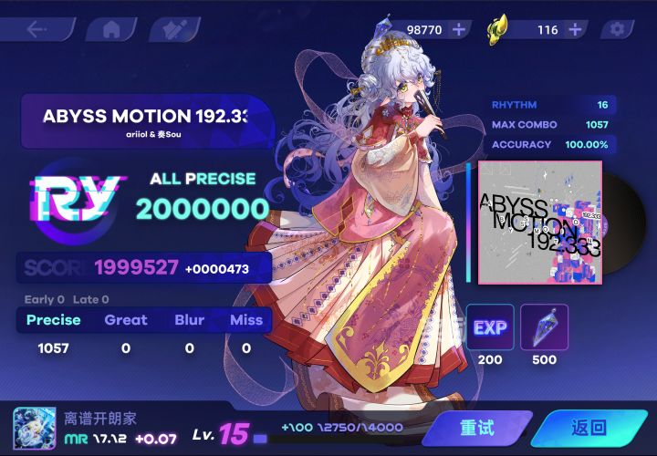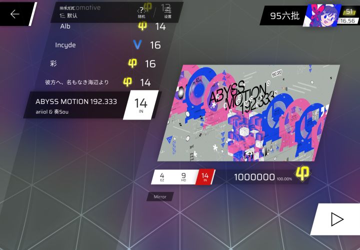 起因是最近(也许挺久了)phigros更新的ABYSS MOTION192.333太好听了,但是谱面太简单,然后想到,ryceam之前也出过这首,16级的,于是想着打一打。。。然后意外发现MR的奇特涨分机制(