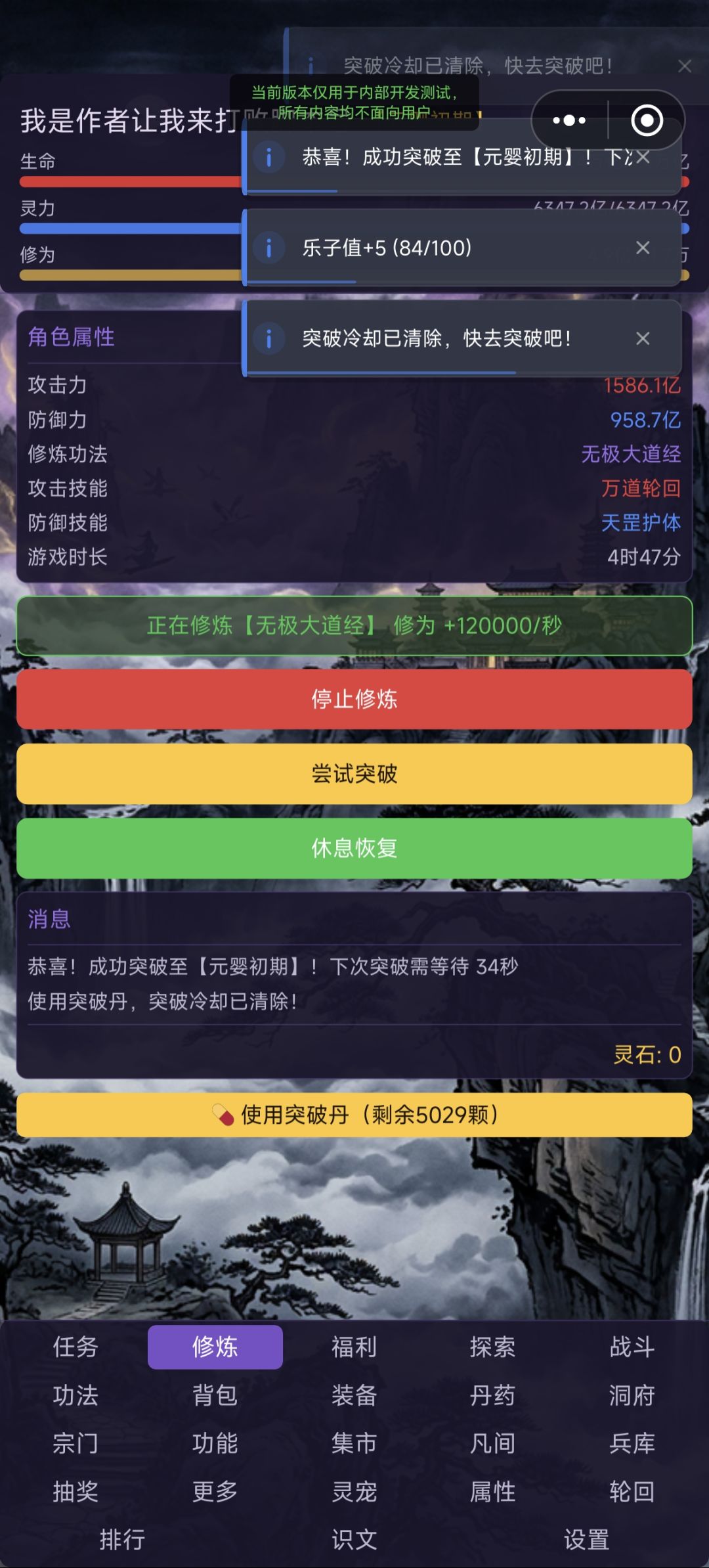 修炼页面放了突破丹的快捷突破,降低了丹毒概率(前期都是0%,1000之后2%,2000以后5%,超过3000次以上10%,但都不会清空修为了!且最多掉2个小境界,可读档)