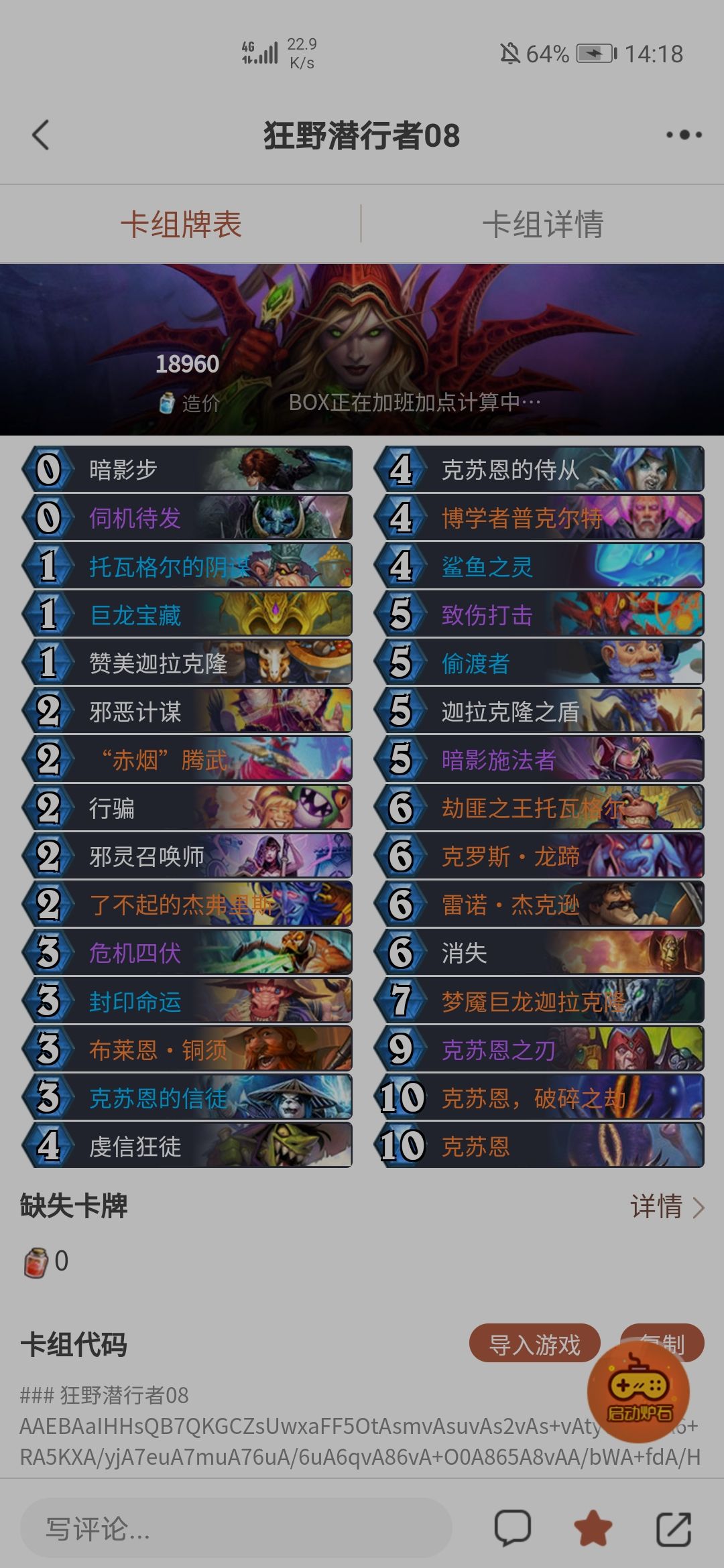 前期稳定抽两个克苏恩碎片,后期抽二号bb机和阴谋洗进牌库的卡,实用,合理!