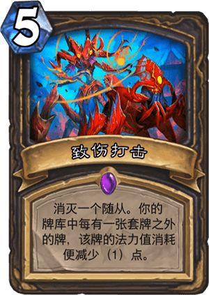 在这套卡组中可以为克苏恩加buff的卡只有四张,不记双倍战吼的情况下通常拍出这张卡时克苏恩身材在8/8或者10/10左右,不具备斩杀能力,但是这张卡可以一次性为克苏恩加可观的攻击力,让其达到15左右就具备斩杀能力了,而且带一张944可以解放一些卡位替换掉去他的克苏恩buff卡