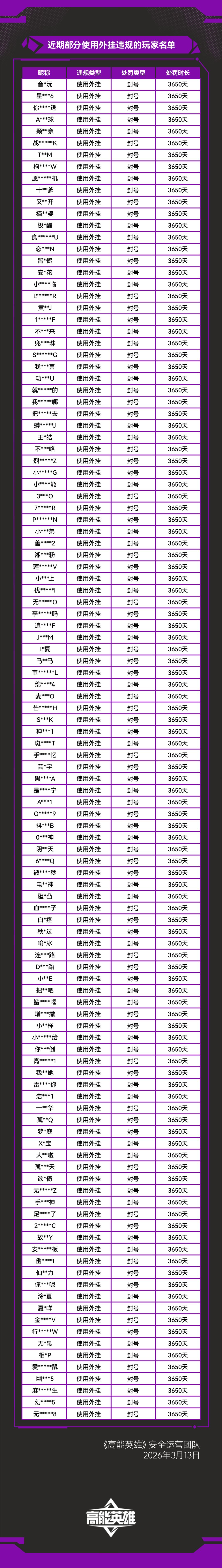 《高能英雄》外挂作弊处罚公告(3月13日)