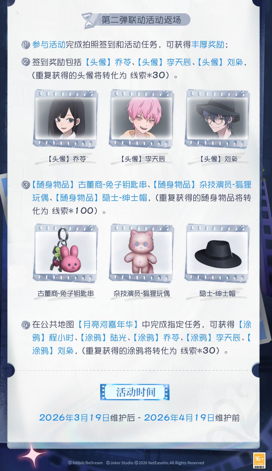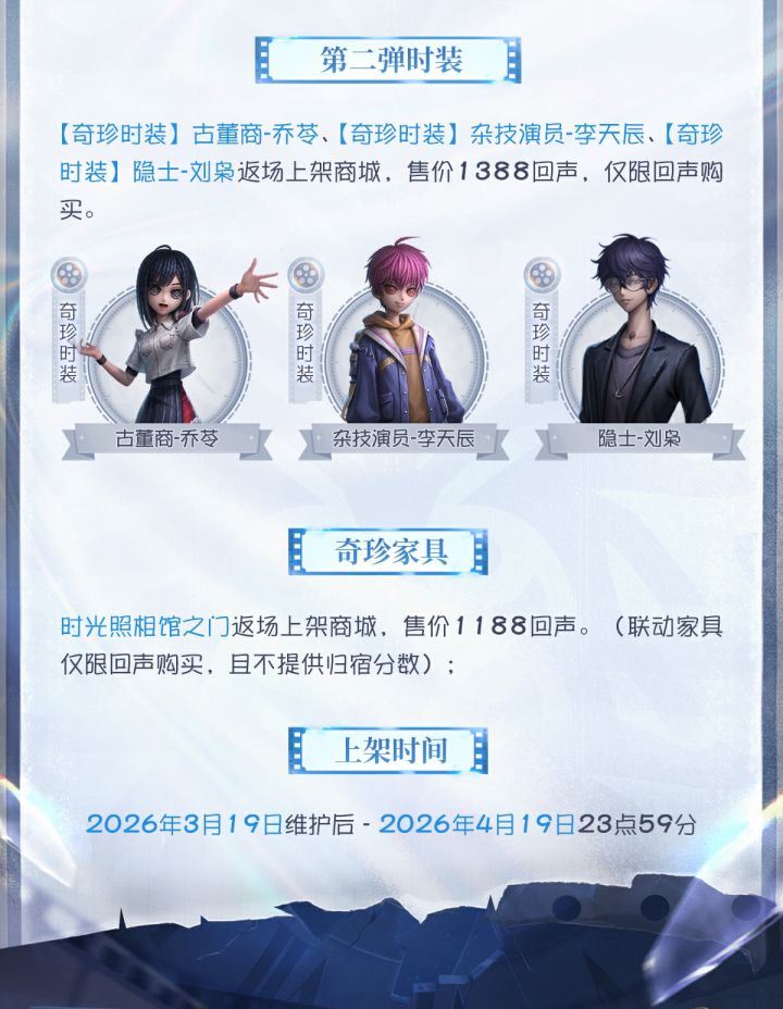 第五人格×时光代理人返场公告来了~ 3月19日,除了联动第一弹&第二弹内容返场之外,参与本次联动返场活动,可获得联动限定头像框【时光相框】、联动限定涂鸦等奖励~