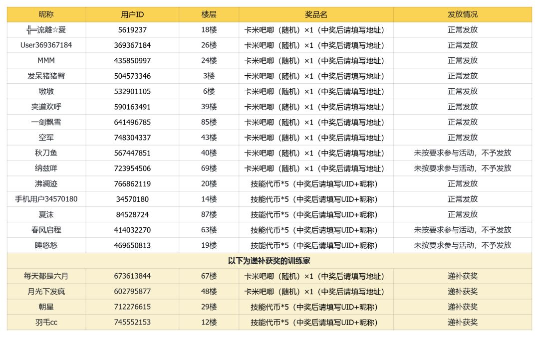 递补获奖的训练家请特别注意以下说明: