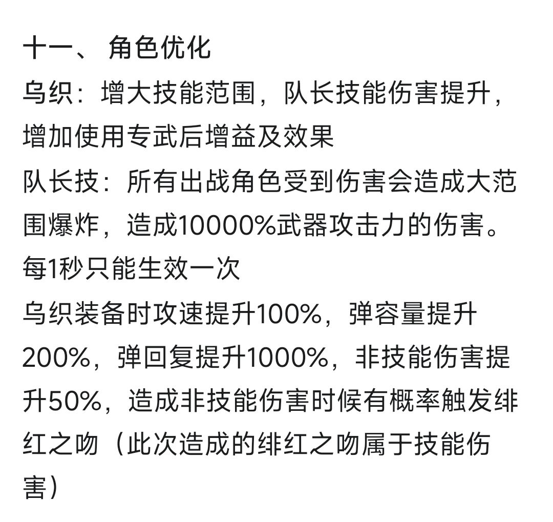 这一次乌织主要增加了队长技能的伤害倍率和范围(2000%→10000%)、主动技能范围(小妖范围→大妖范围)、以及武器伤害(专武增加了50%武器伤害与普攻触发被动效果)。