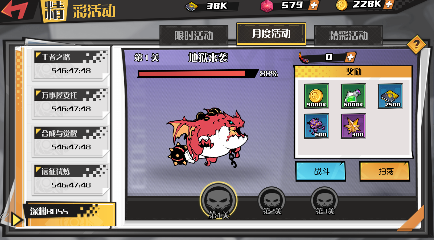 大家可以通过点击精彩活动,然后在月度活动中找到深渊boss。深渊boss一共分为3个关,每一关的奖励遇上一关的相比都会有极大的提升,通关之后可以获得大量的资源。因此大家每天一定要记得收集完恶魔之角之后来打深渊boss,会极大提高大家的英雄练度。 大家第一次打的时候可能会发现自己的伤害会比较刮痧很难打,不过不用担心,深渊boss一个月刷新一次,有充足的时间来刮死boss,