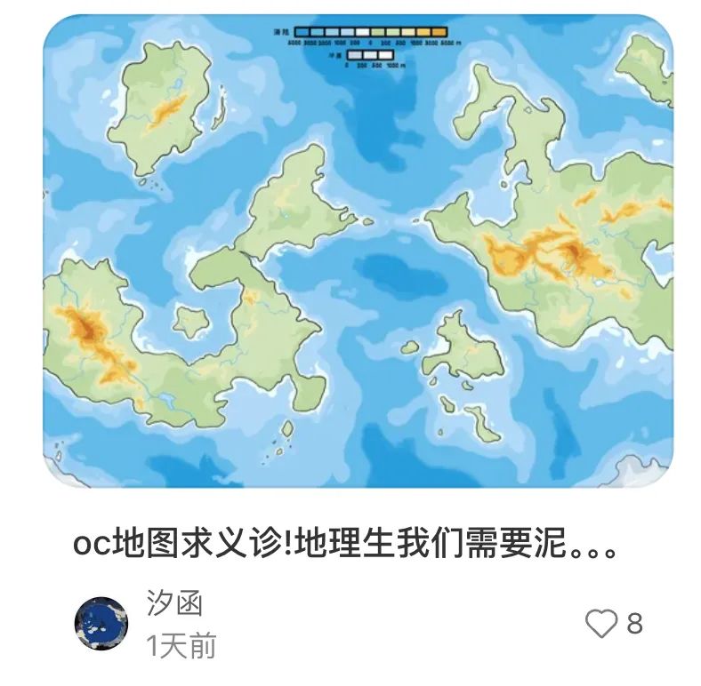 这些OC地图不是随手画几个图形那么简单。山脉、海洋、分层设色……要素一应俱全,完整度高得惊人。