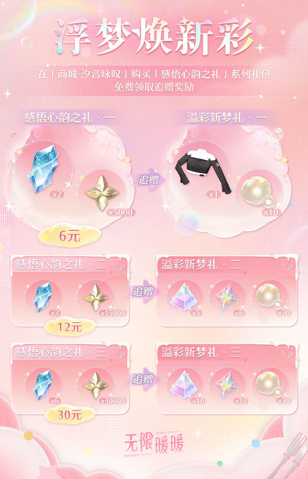 花费30元购买「感悟心韵之礼·三」可立即获得感悟水晶*6、噗灵*30000,并获得璨光棱镜等好礼。