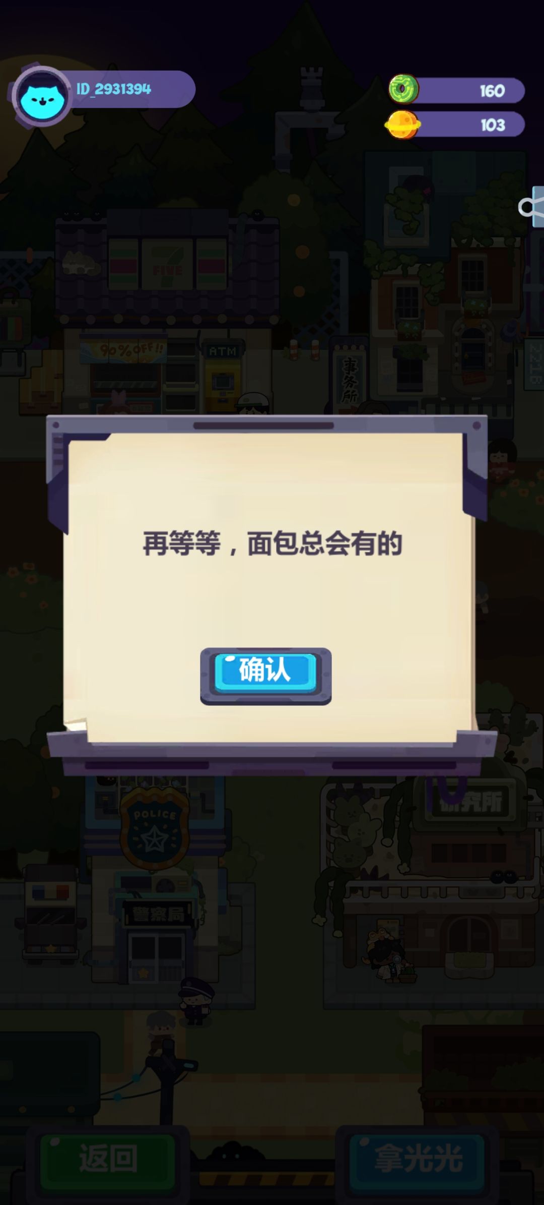 昨天预约完粒粒的小人国就给我推这个游戏了,我不知道停更了,看画风就下载了,还跟朋友一顿夸,就感觉小细节什么都做的很好,上一页是“啥?”下一页是“哦,懂了”,跳过是“别啰嗦了”,战斗界面是一个类似游戏机的画面,居民npc说话太多了字还会越变越小,领取奖励是“拿光光”,没有东西领是“再等等,面包总会有的”。