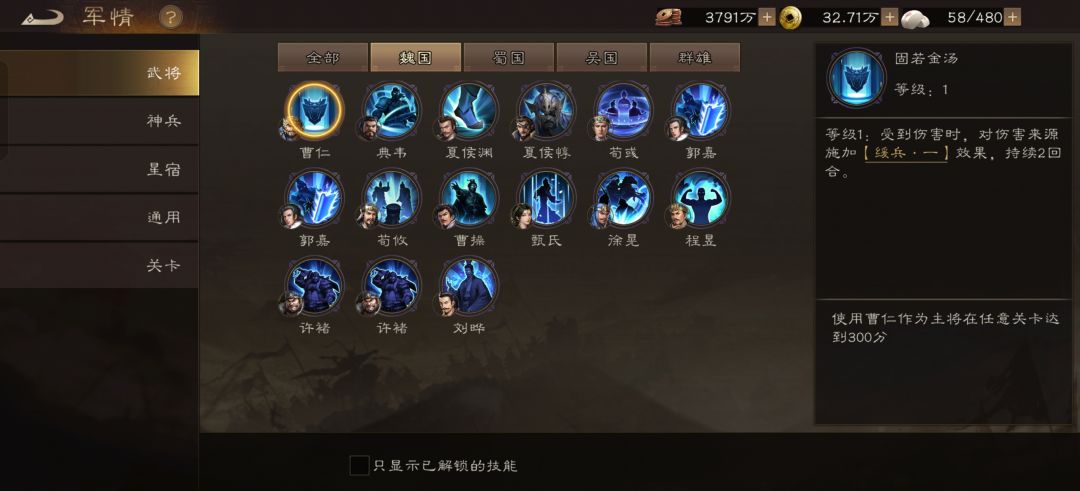 · 曹仁(单体控制):技能【固若金汤】在受到伤害时,对伤害来源施加【缓兵·一】(减速2回合)。
