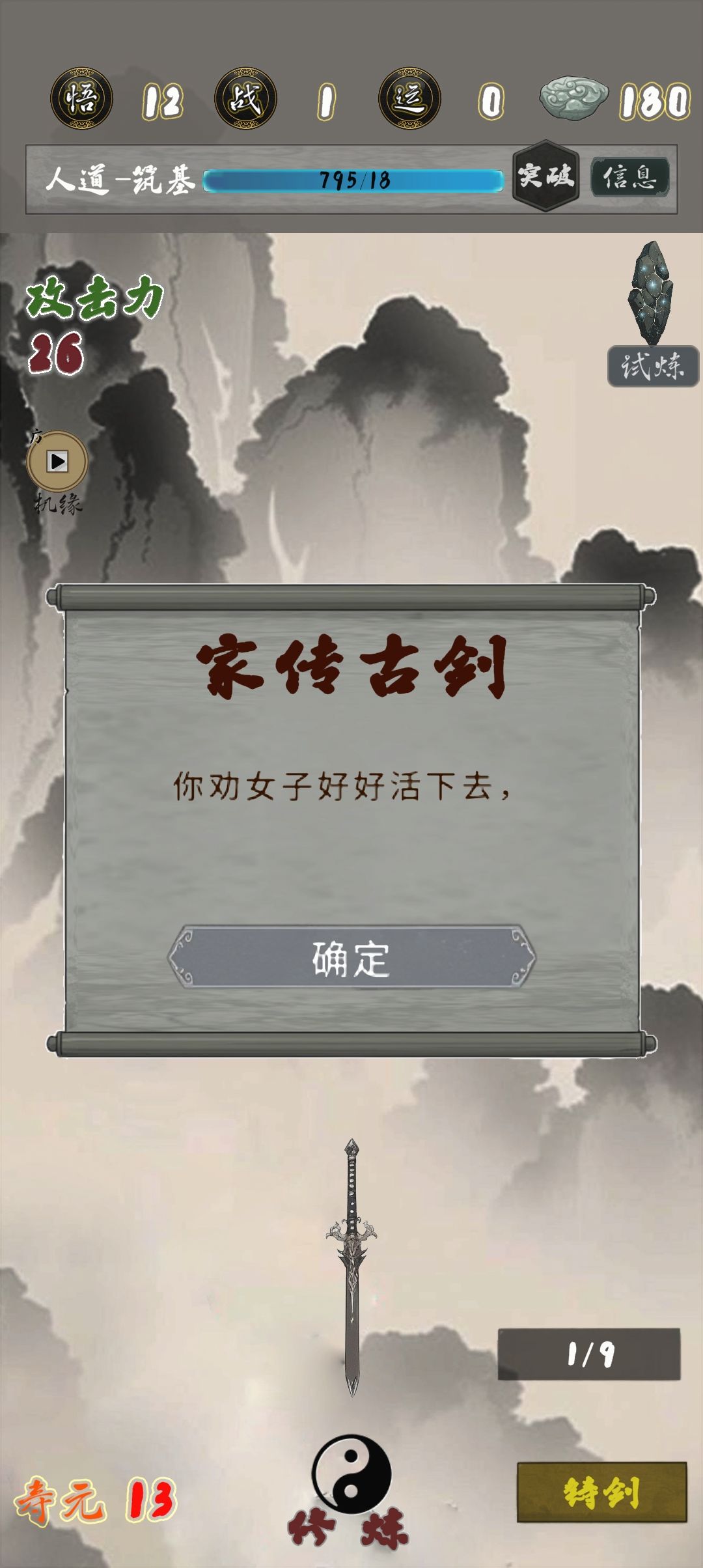 人物修为筑基:[1]不允许荡秋千→询问原因→决定找出真凶(30血)→物归原主和收取古剑可以获得七星龙渊,归还古剑教他修炼功法可以收它为弟子(后续应该还没做)。
