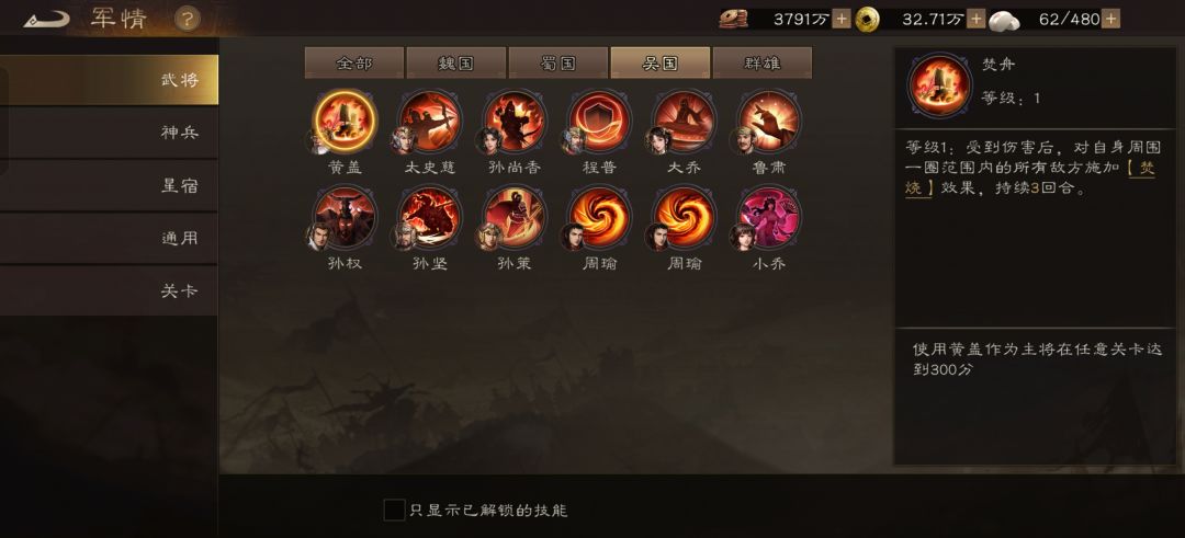【焚舟】:受击后对自身周围一圈敌军施加【焚烧】3回合。作为低输出法系武将必选技能,他能低成本为敌方群体挂火,是焚烧队的稳定启动器。