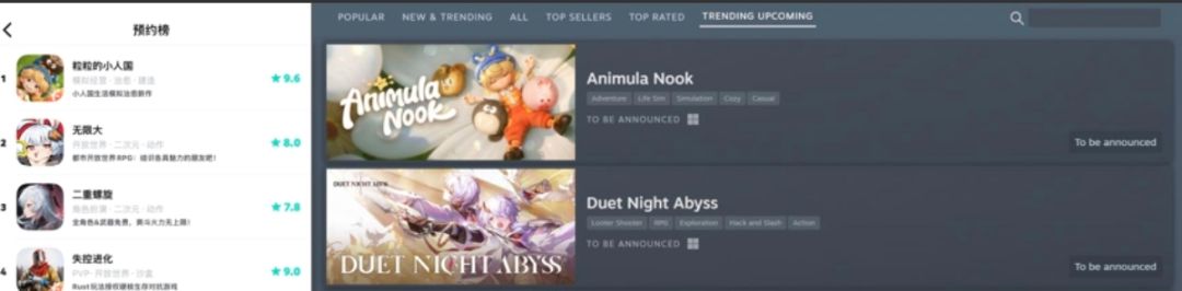 多日霸榜taptap预约榜以及steam新游榜