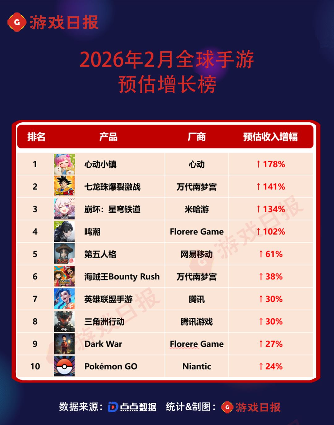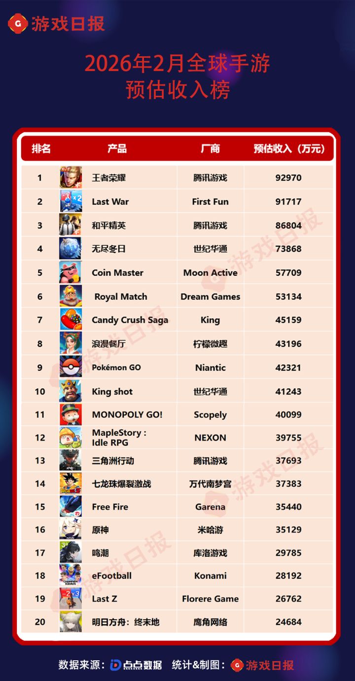 而在前20中,腾讯《三角洲行动》排名由第1月的第二十位升至本期榜单第十三位。在2月,《三角洲行动 》举办新春红人杯,推出与海底捞的联动活动,并邀请刘涛等多位明星担任活动代言。鹰角网络《明日方舟:终末地》开服第二个月热度依旧,收入环比增长4%,成功进入TOP20。2月,《明日方舟:终末地》更新了1.0版本,分别在上下半卡池推出了角色洁尔佩塔和伊冯。在下半卡池上线后,游戏在全球七个国家和地区中来到了iOS游戏畅销榜前十,其中国服第8、韩服第5、日服第4。NEXON 旗下冒险岛IP新作《MapleStory:Idle RPG》于2025年11月正式上线。上线首月,该游戏全球收入达3.7亿元;2025年12月、2026年1月,其单月全球收入均攀升至5亿元以上;2026年2月,游戏全球收入为3.9亿元,虽环比下滑约24%,对应全球手游收入榜排名降至第十二位,但该作仍堪称近期手游市场的现象级产品。除此之外,柠檬微趣《浪漫餐厅》与世纪华通《奔奔王国》排名较1月均有所上升。万代南梦宫《七龙珠爆裂激战》二月举办了11周年庆,增长幅度超100%,进入榜单第十四位。