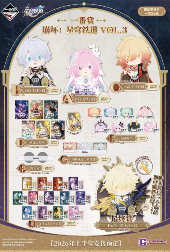 本次一番赏3月16日率先登陆天猫miHoYo旗舰店,其他渠道于3月28日陆续开售,单抽建议零售价58元。赏品包含A~G赏与最终赏,其中A、B、C赏分别为昔涟、白厄、万敌坐姿毛绒,最终赏为卡厄斯兰那坐姿毛绒,抽完最后 1 抽即可额外获取。