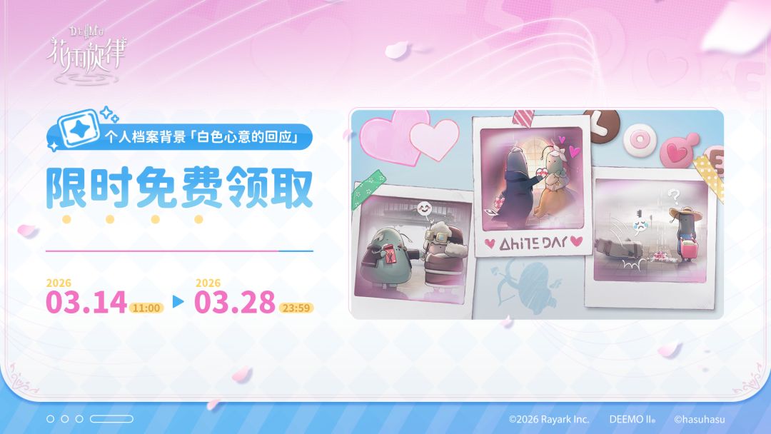 ◆ 2026/3/14 11:00 ~ 2026/3/28 23:59期间登录游戏,即可通过邮箱领取个人档案背景「白色心意的回应」!