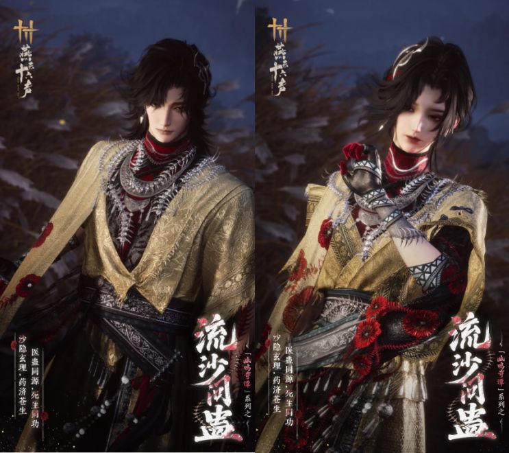 「幽鸣奇谭」系列首款外观【流沙问蛊】更新后上架,售价1280长鸣珠,支持拆分染色,附赠头像与全套配饰。联动武器【秋鸿踏枝】限时2音玉兑换,分享可领限定题跋;「八方风雷枪」特效【英魂照骨】可用1个八音窍兑换。