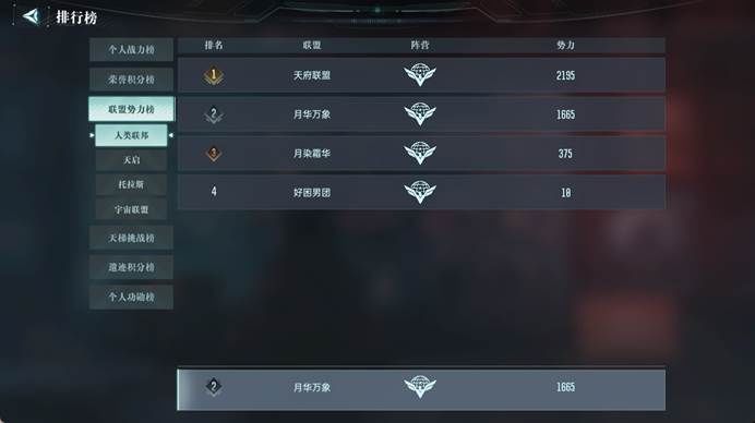赛季初期,人类联邦内部月华万象与月染霜华联盟形成协作。月华万象率先攻占通往能量中枢区的“天坛座”关口,并控制了能量中枢区的多个据点。月染霜华则夺取了通往量子中枢区的“绘架座”关口及邻近的量子中枢站。
