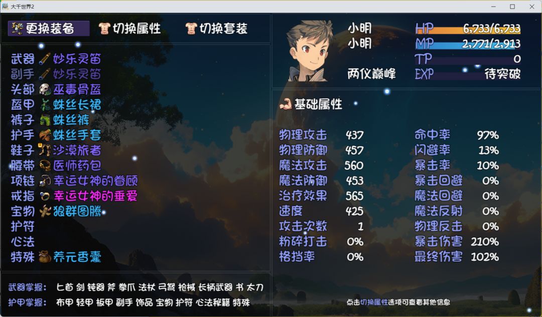 跑刀流程较长且我的操作比较丑陋,具体怎么规划路线还是看看论坛大佬们的思路,这里就不过多介绍了,总之在刷齐乌龟心法与阵容对应数量的蘑菇头后,你的坦度就足够挑战深渊或王都boss了(和我相同或更低的配置可能容易翻车,以及下水道对输出要求高,我这个低配阵容伤害实在是不够了,尽可能高配,可以先刷深渊和王守),最后就展示一下刷完乌龟套后角色的配置,剩下的就交给大家自由发挥了,助大家把把天工神妙![[表情_斜眼笑]](https://img-tc.tapimg.com/market/images/d1b1dcc88719f6c9a639728cde152c4b.png)