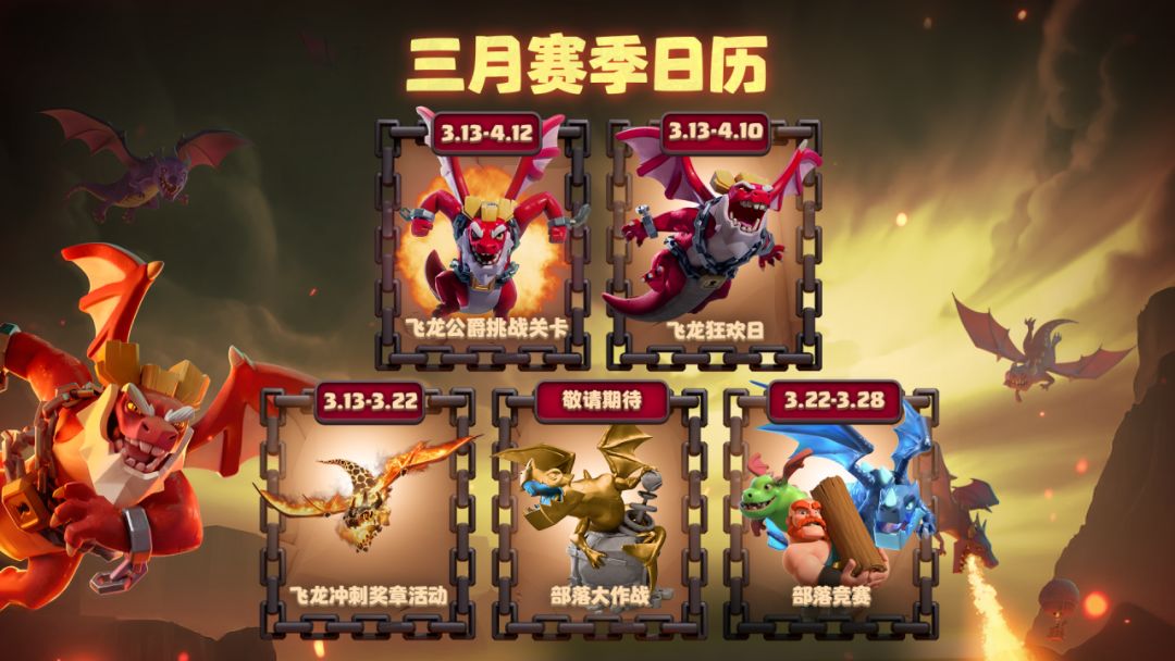 部落竞赛(3.22-3.28)——飞龙相关的任务将更频繁出现,且提供的部落竞赛积分将比以往更高!在进攻中使用飞龙公爵还可获得更多。
