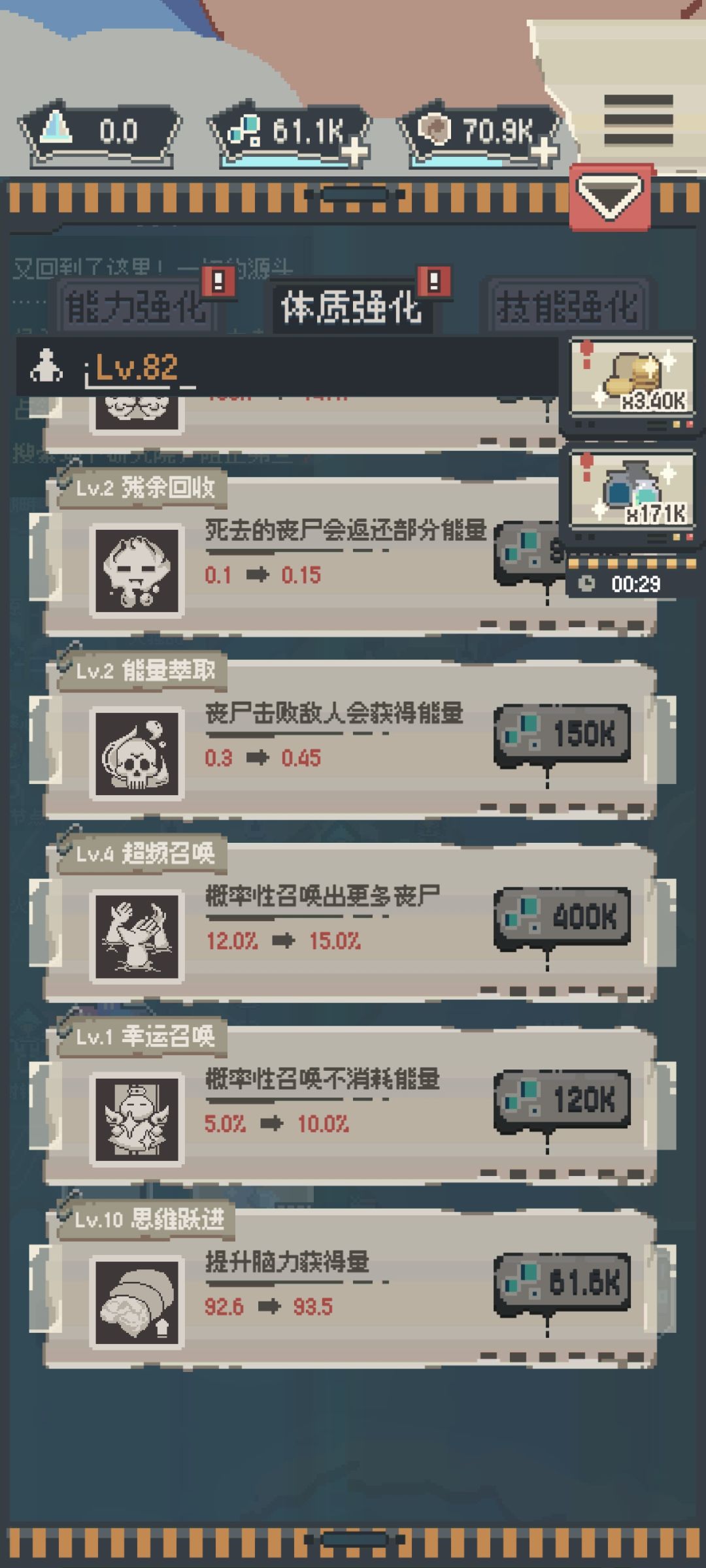 由于不知道要堆血量和脑力后再看广告,看了3天广告才通关,技能是各升级了80级左右,战力26000才通关的。超频召唤和幸运召唤是神技,得优先升级。