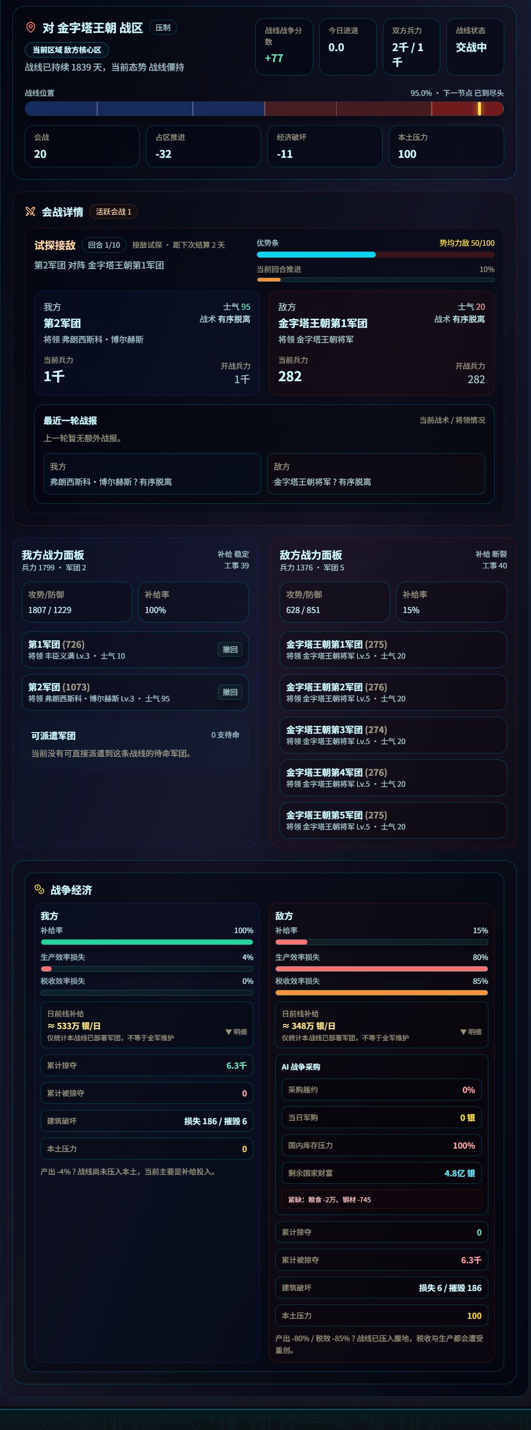-战线系统:战争触发后自动生成战线,7 个区域 + 5 个检查点,战线位置动态影响双方经济