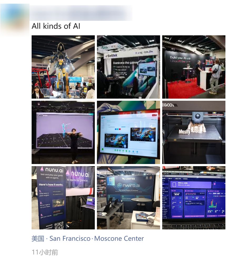 今年GDC的“含AI量”高得惊人——几乎所有身处旧金山的同行,都忍不住这么感叹。从以演讲为主的西厅,到主舞台所在的南厅,莫斯康会议中心的各个角落都被科技巨头和AI创业公司的展台包围。AI游戏策划和投资人在群里频繁约局;排队入场的间隙,前排的程序员小哥掏出电脑敲下几行字,Claude Code就刷刷生成一大片代码……