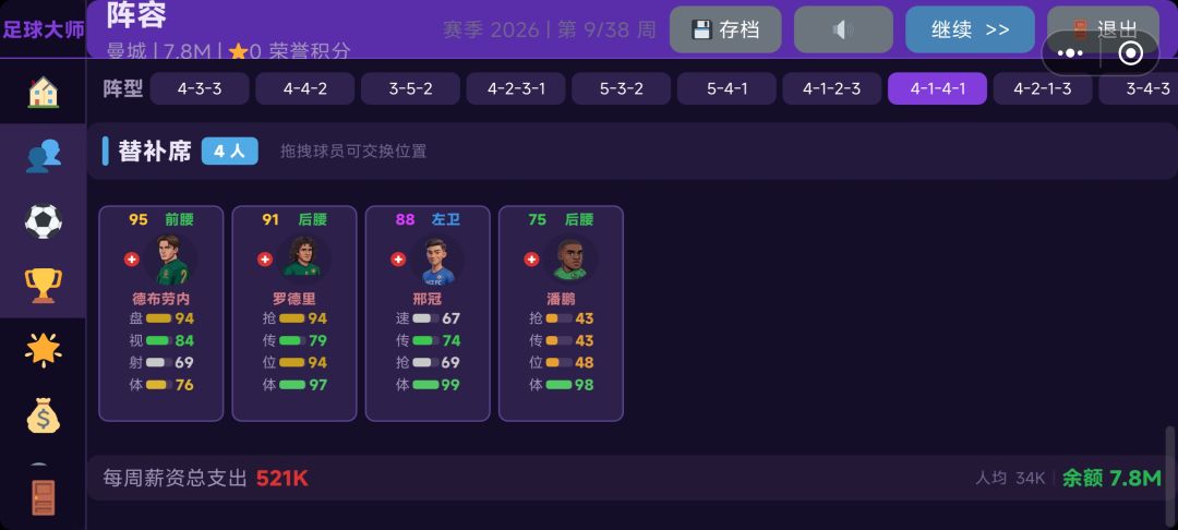然后就是钱的问题,球宝能赚钱其实很好,但是球员工资变化还是很奇怪,特别对于弱队来说。好不容易培养了几个高能力值的,结果第二个赛季工资暴涨直接入不敷出了,有球宝也不太够。体验就比较差。