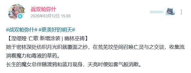 这次爆的内容是新皮肤,分别是新S级机体涅缇娅亡歌的新皮肤幽林巫祷,以及薇拉灼惘新增特效皮肤焰血裁决,新版本更美好的明天更新后就能入手,获得方式是入手对应礼包