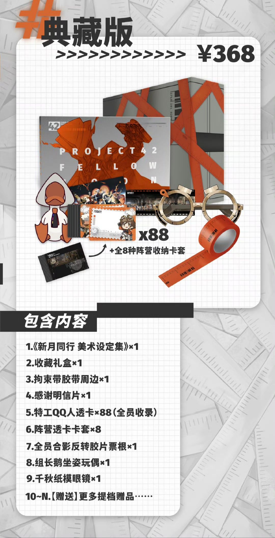资料显示,《新月同行 美术设定集》众筹将从3月13号到4月20号,将持续5周时间。众筹档位分为最低¥198到最高¥368,内容包含了《新月同行 美术设定集》、明信片、胶带、透卡卡套和玩偶等物品。