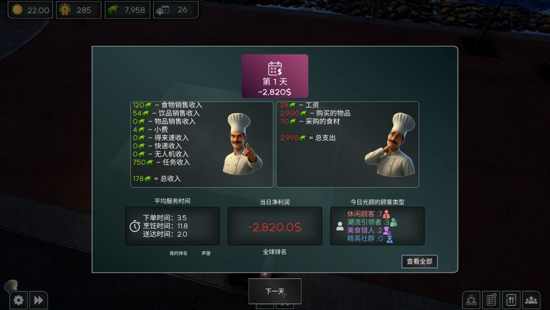 再就是本作目前正处于抢先体验阶段,一些内容还没有完全开发完,对比其他同类型的游戏还是有所欠缺的部分。而且餐厅的位置是真的不行,不仅没有商业街,还是在公路旁,但这都有人来吃饭就挺离谱的,甚至还有商业互吹环节,吃完之后会说这里的美食天下第一需要多多向其他人推荐,少了一些餐馆的必要环节。