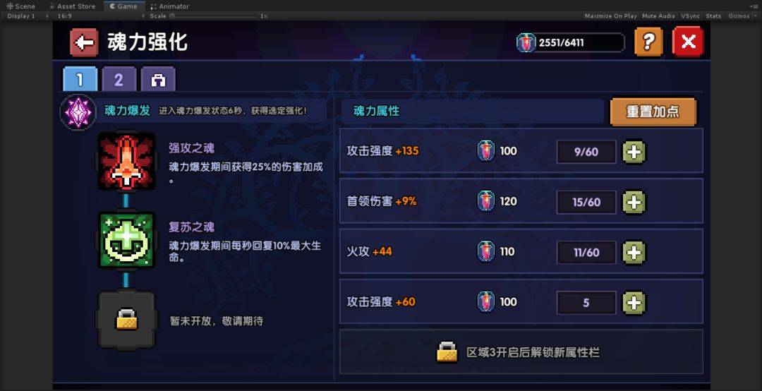总魂力达到一定值后,可以开启新的连接区域,可连接更多武器。开启新的区域后,可解锁新的魂力属性栏,并获得一个魂力加点方案重置道具——灵魂之种。