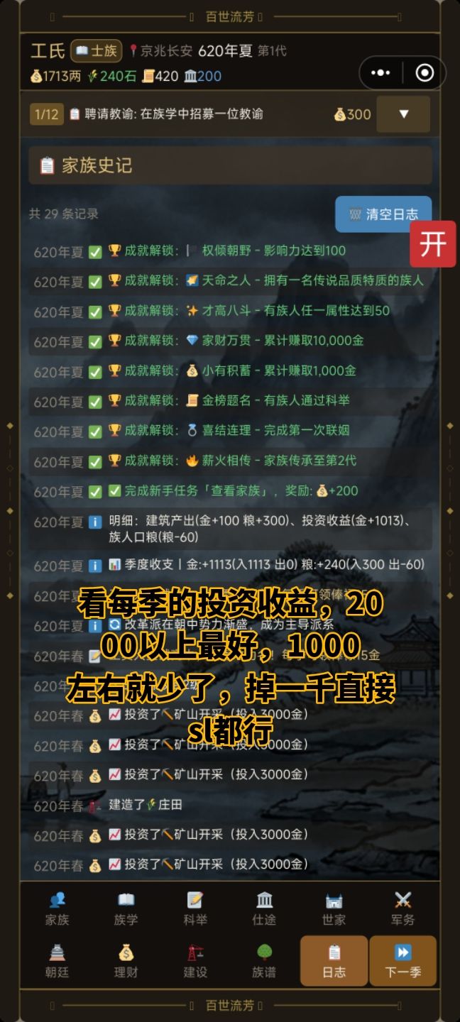 这样来,sl财富自由流你就学会了,接下来只是需要注意每一季你的股市涨跌和产业收益了,按照你的心意来,怎么样你觉得赚得多,就怎么来,也不必一定按照我的标准,想跌到-190左右买也行,想涨到150以上卖也行。只不过不一定好刷,实测基本是这个区间了。然后你每一季获得的钱都存进银号里面,等到跌到-150左右的时候,把钱全部取出来买入就好。