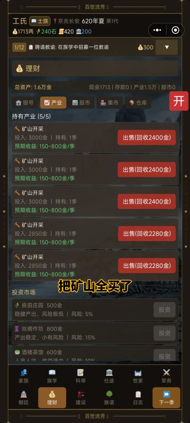 ——重点来咯,进入游戏我们不要想太多,把主角挂科举,接下来开始操作,把开局5000石的粮食全部卖了,这时你会获得10000金,我们现在手里就有18000的金,接下来点建设,把庄田点到2级,商铺点到1级,剩下的钱去理财—产业,把矿山开采全买了。